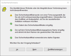Beim ersten Start wird ein Zertifikatsfehler und ein Sicherheitshinweis angezeigt. Es müssen